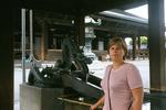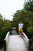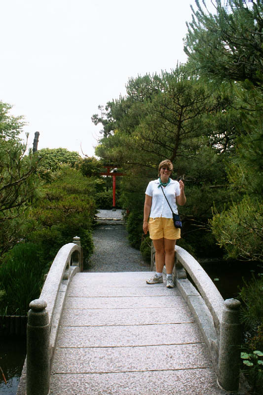 | Wloczymy sie po ogrodach Ryoan-ji, (z tylu nawet wszechobecna tori) Heather on another bridge. |