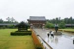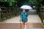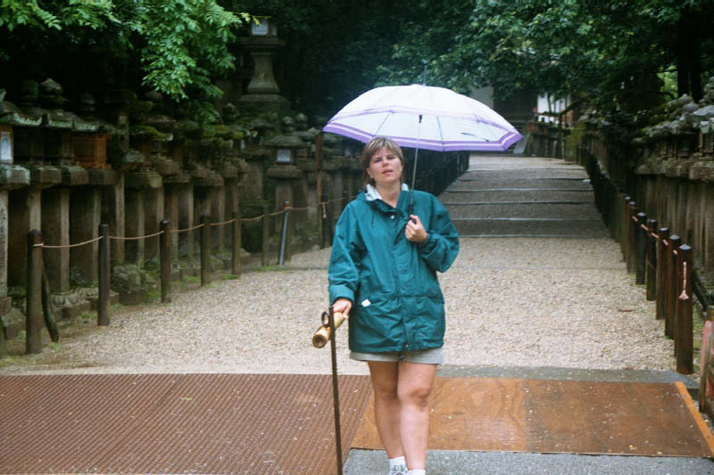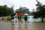 | Trzy czwarte (z nieodlacznymi parasolami) stara sie usmiechac przed najwiekszym drewnianym budynkiem na siwecie w Nara, w ktorym jest olbrzymi drewniany posag Buddy The wet traveler's in front of the Todai-ji Temple. It is the largest wooden building in the world and houses the Great Buddha, one of the largest bronze statues in the world. |