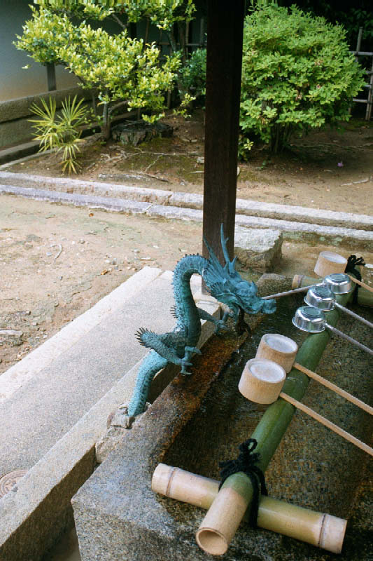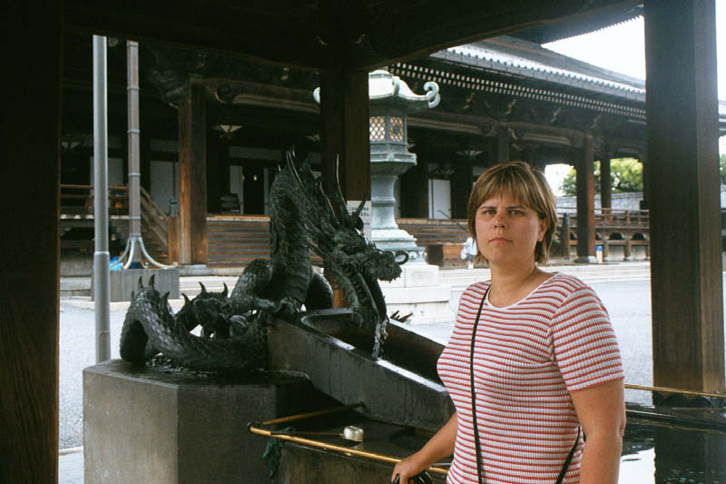 | Nie wiadomo, kto ma grozniejsza mine :-) A cool dragon fountain outside a Buddhist temple near our Ryokan in Kyoto. |