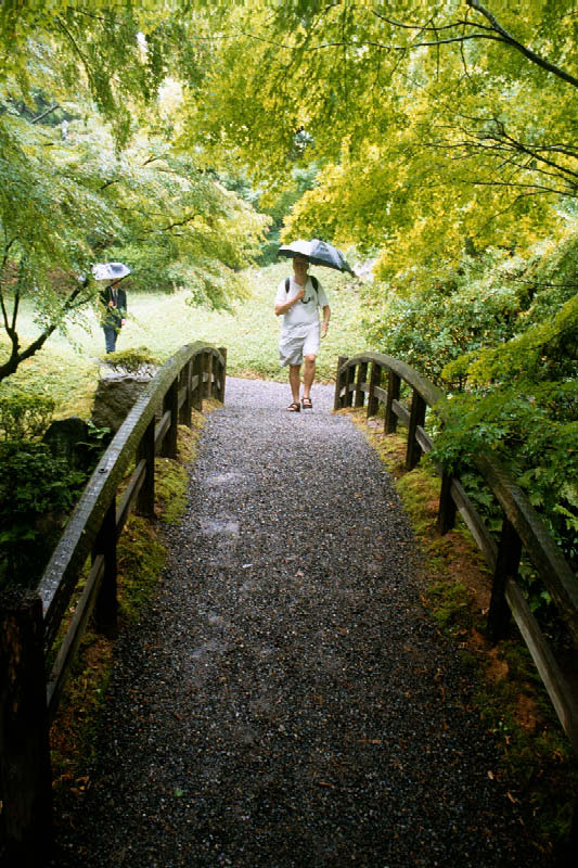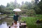 | A to juz ogrod w palacu cesarskim Sento, Mirek z parasolem przedziera sie przez gaszcz Mirek walking up the garden path at the Sento Palace. |