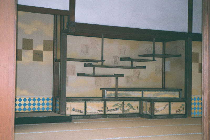 | Polki jak "snujaca sie mgla" The most famous shelve in all of Japan. They are called the "Trails of Mist" and are mounted along the back of a tea room within the villa. |