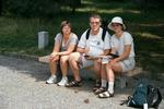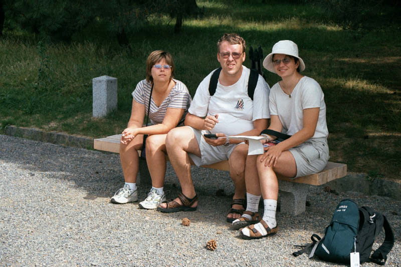 | Kyoto, dzień pierwszy,siedzimy na ławce czekając na otwarcie pałacu cesarskiego. Here are the travelers's in Kyoto. Heather, Mirek & Ada (Grzegorz is taking the picture). |