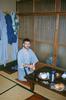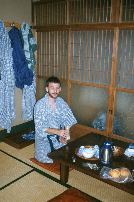 | A to Grzes w japonskiej szacie domowej (yukata) Grzegorz posing for a picture in his yukata (Japanese robe) inside our ryokan. We would sit on the pillows to use the table, and sleep on pillows on the tatami floor. |