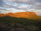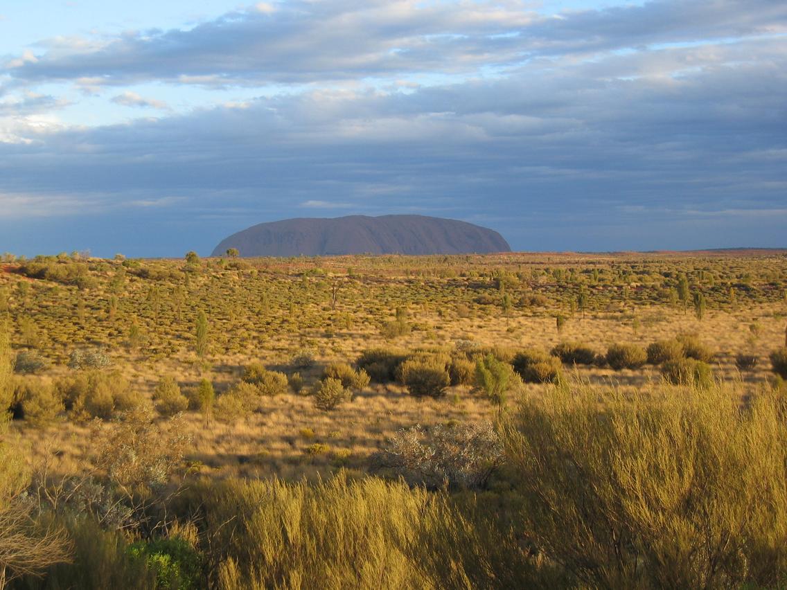 | After we left Kings Canyon, it was onto the red rock - Ayers Rock or Uluru as the aboriginal people call it. While the clouds didn't cooperate at sunset, the rock is still visible. It should be as it is the largest monolith in the world at 348m (over 1000 feet) tall and 3.6 km (over 2 miles) long . And that is with 2/3 of the rock below ground! |