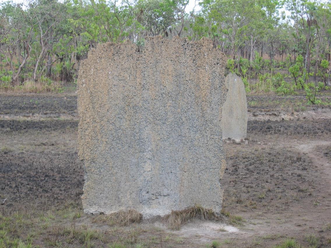 | The termites construct their termite mound on the magnetic poles, for temperature controls. When the sun is low it hits the large sides of the mound, warming it up. Once at the top when it would be too hot, only the narrow top edge is exposed. These mounds survive the "wet" season by being impervious to water and fire. |