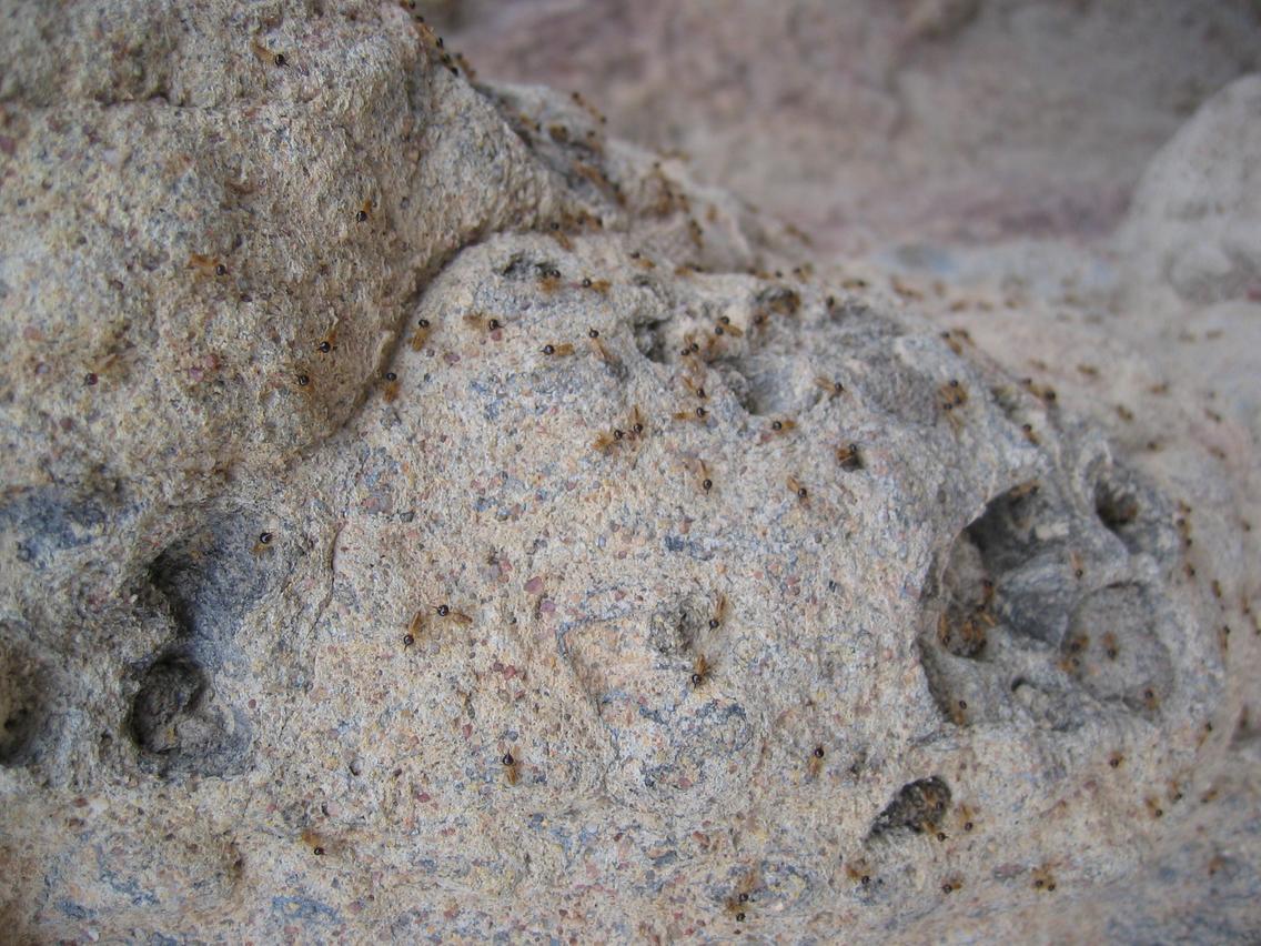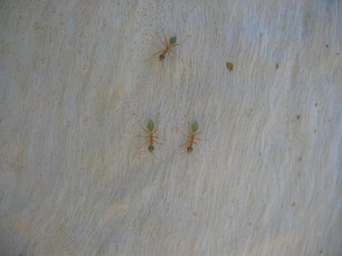 | Green ants are clearly visible on the white trunk of a Gum tree. If you lick the 'bum' of a green ant, you get a charge not unlike licking a battery. The aboriginal people would make a tea from green ants (boil then strain them). Apparently they are high in vitamin C. |