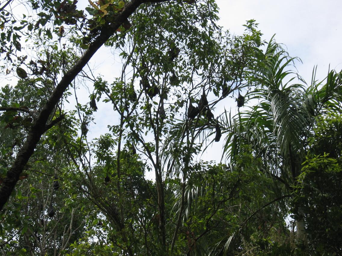 | It is difficult to see them, but there are flying foxes hanging from this tree. They were everywhere around the waterfalls. Unlike bats, these look like actual foxes, with bat wings. Strange! |