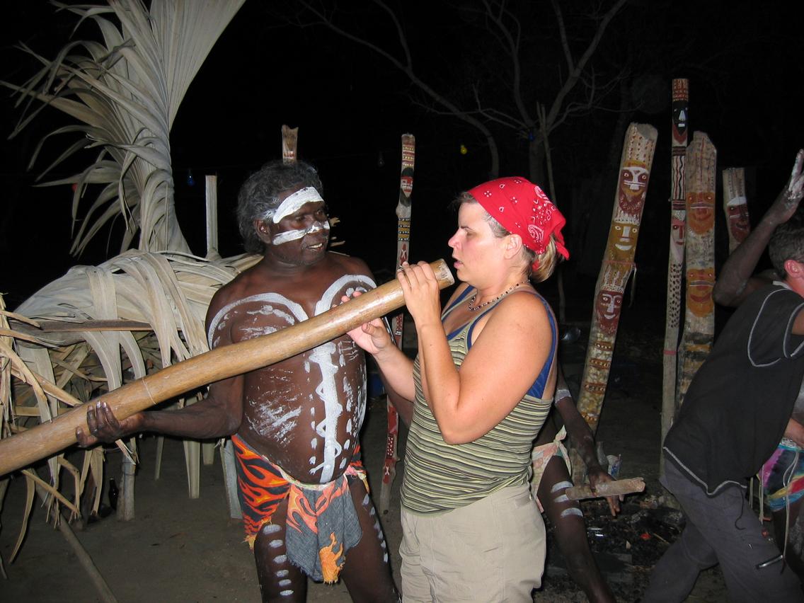 | Afterwards, they were kind enough to give us didgeridoo lessons. It is much harder than it looks. I think tuba players may be better at it than I, as you need to blow hard while letting your lips flap around like a horse neighing, or blowing raspberries. And that is only to get a basic sound out of it! |