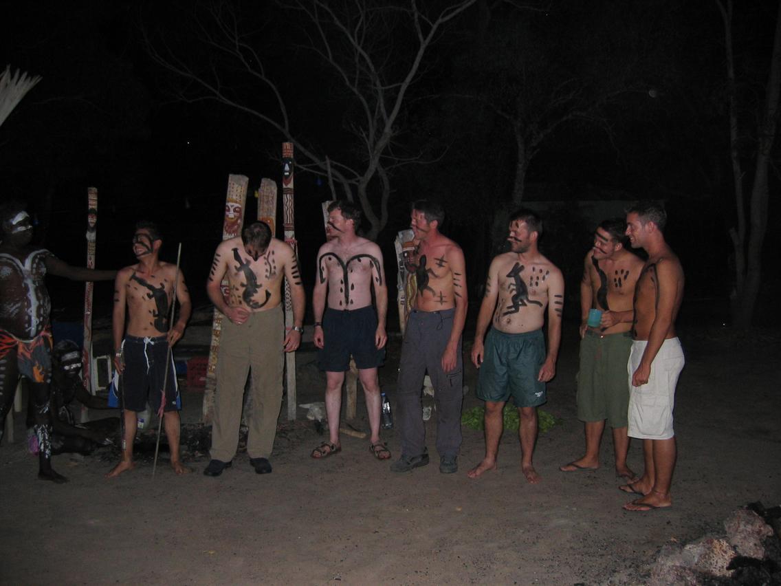 | We were also given the opportunity to participate in some of their dances. Except while the aboriginal people paint themselves with white paint, it wouldn't be visible on white men, so they painted them with black paint. Here is "Kangaroo Man". |