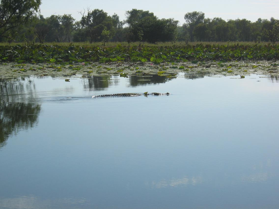 | Beautiful water lilies grew all over this billabong. There were several colors, some native and others introduced from Asia. When the center pod turns large and green, you split it open and can eat the seeds. |