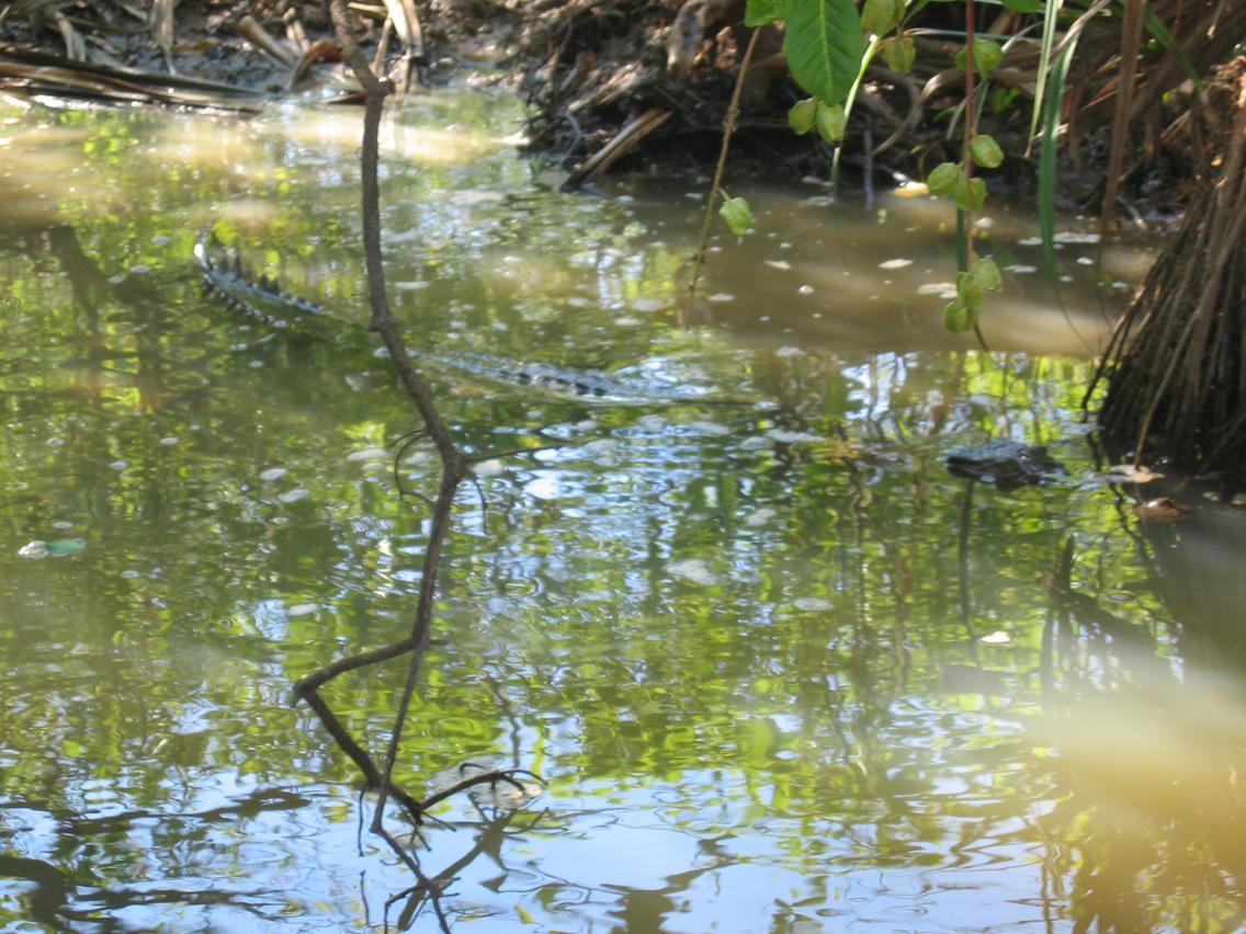 | Next it was onto a river cruise. Here is our first siting of a saltwater crocodile. This one was estimated to be roughly 7 meters long. We didn't get too close as you might imagine. |