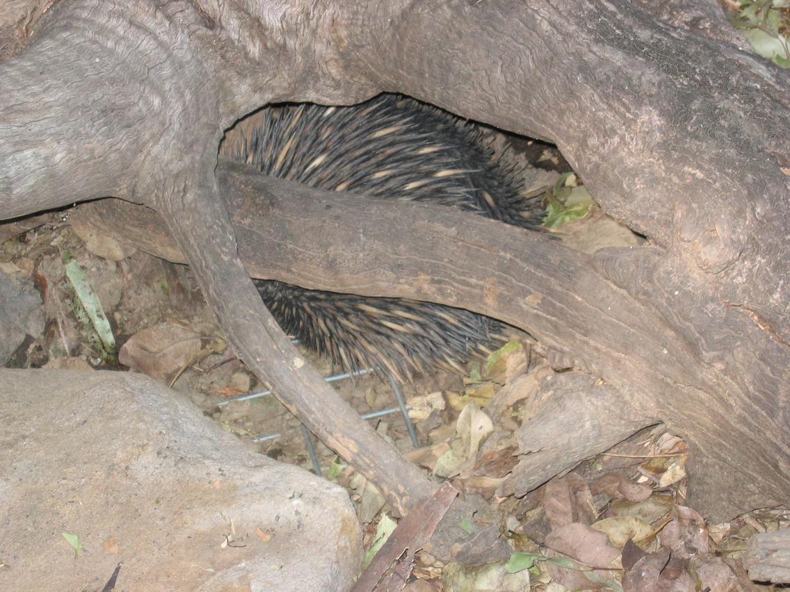 | What looks like a porcupine to us from North America, in actuality is an echidna hiding in a log. |