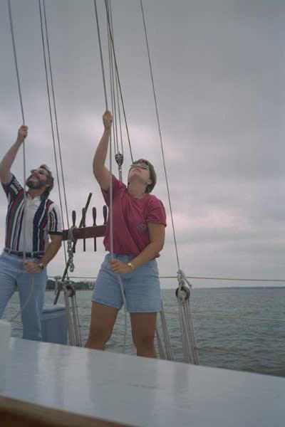 | Pozeglowalismy troche na szkunerze "The Pride" - 84 stopy, klasa C. Co prawda raczej jako pasazerowie, ale dali posterowac przez chwile i pobawic sie zaglami | We sailed a little on The Schooner Pride (84feet, C class tail ship). We have heen rather passengers, but I've managed to steer and Heather was helping with sails. | |